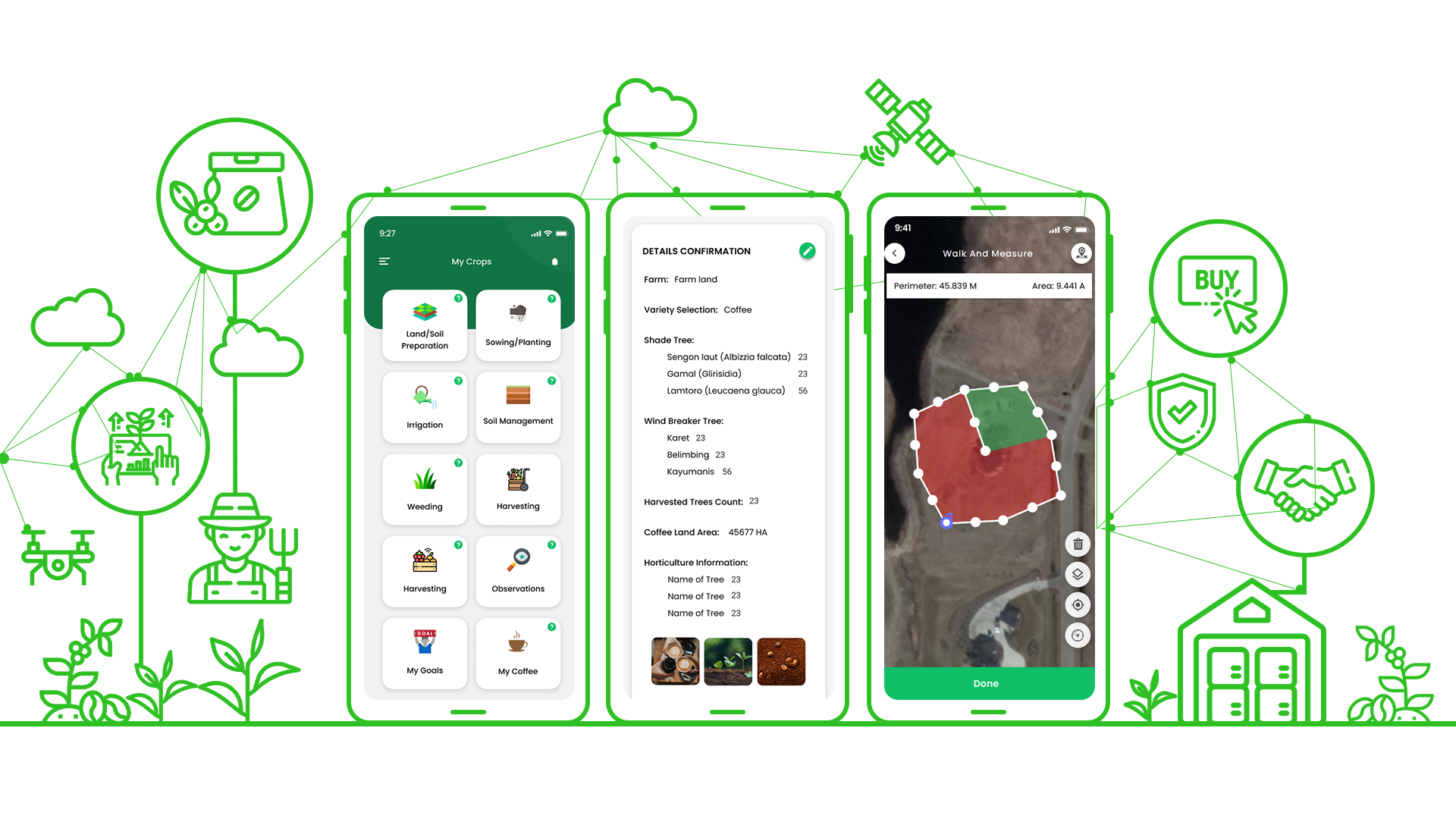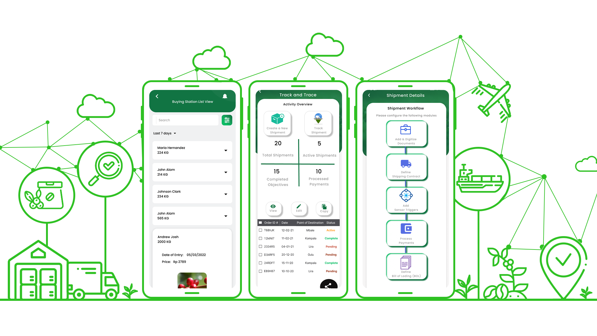 Connected Coffee is a multi-stakeholder platform that has interfaces for farmers, cooperatives buying stations, dry milling, warehouses, exporters and importers for track and trace, resource optimization and increasing productivity.
